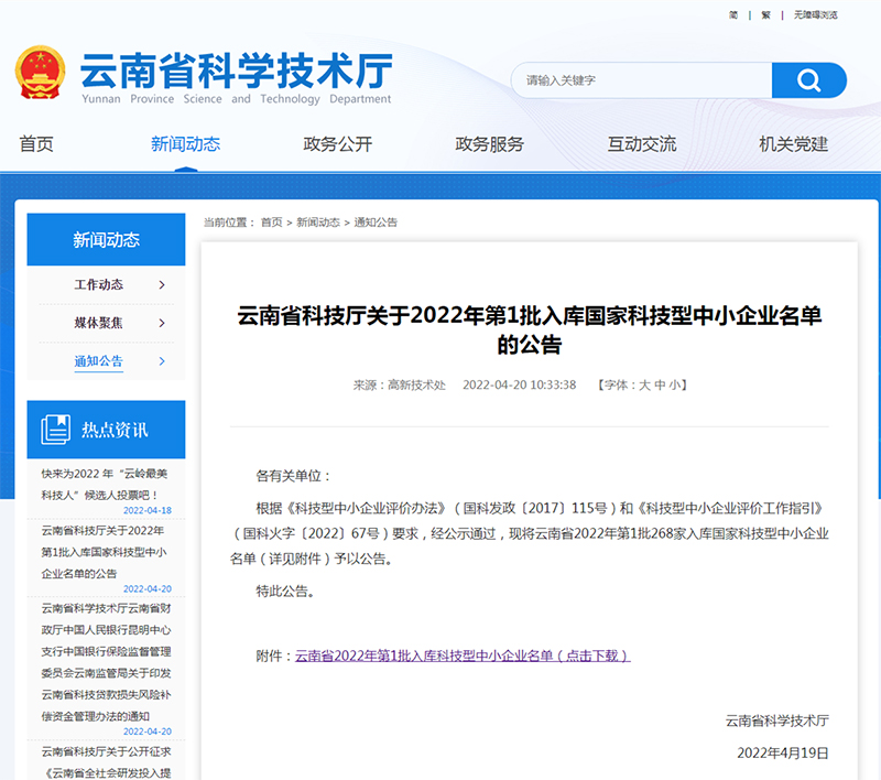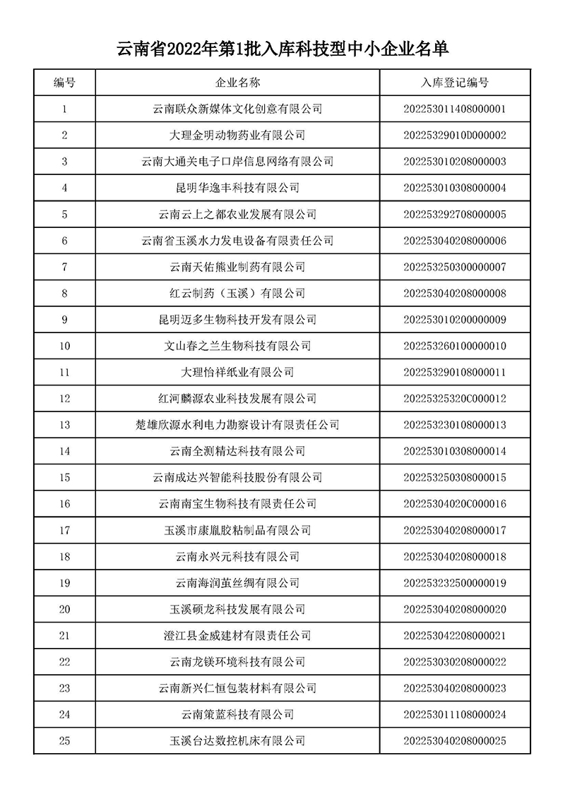 【概要描述】近日,云南省科學技術(shù)廳發(fā)布《云南省科技廳關(guān)于2022年第1批入庫國家科技型中小企業(yè)名單的公告》。根據(jù)《科技型中小企業(yè)評價辦法》(國科發(fā)政〔2017〕115號)和《科技型中小企業(yè)評價工作指引》(國科火字〔2022〕67號)要求,經(jīng)公示通過,現(xiàn)將云南省2022年第1批268家入庫國家科技型中小企業(yè)名單(詳見附件)予以公告。