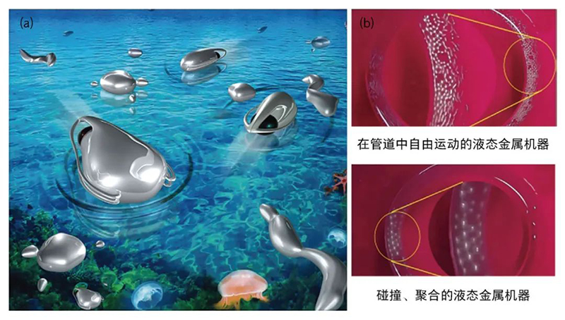自驅(qū)動(dòng)液態(tài)金屬機(jī)器 (a)液態(tài)金屬自驅(qū)動(dòng)機(jī)器 [4];(b)可碰撞、聚合的液態(tài)金屬瞬態(tài)機(jī)器 。