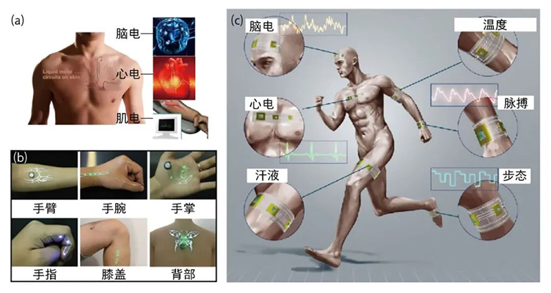 液態(tài)金屬可穿戴電子用于健康監(jiān)測 (a)打印于皮膚上的液態(tài)金屬傳感器 [9];(b)身體各部位的液態(tài)金屬電子紋身 [8];(c)可穿戴液態(tài)金屬柔性電子用于生理信號檢測。