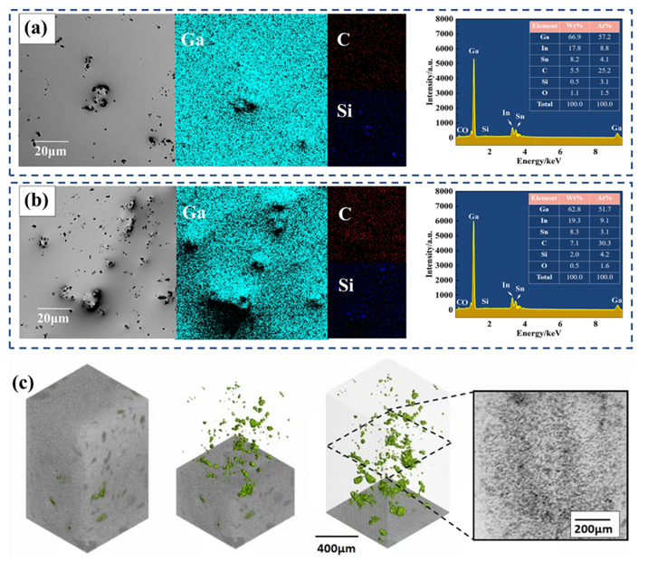 該工作利用納米Mo改善液態(tài)金屬和SiC/石墨烯納米顆粒之間的相互作用能量關(guān)系,促進這些難以結(jié)合的納米相的穩(wěn)定分散,在廣泛實驗各種LMNF體系的基礎(chǔ)上,篩選出納米相穩(wěn)定性最佳的組分,并利用SEM+EDS和CT斷層掃描證實了納米相的均勻分散(見圖1)。