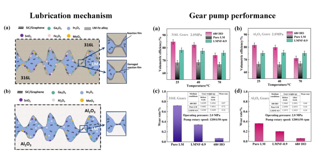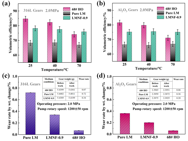 最后,該研究在小型工業(yè)級液壓系統(tǒng)中評價了LMNF的工作性能(見圖4),表明相較于純液態(tài)金屬而言,LMNF能夠提高了齒輪泵的容積效率,彌補LM低粘度的缺點。與傳統(tǒng)液壓油相比,LMNF的容積效率隨溫度的變化很小,其抗磨性能得到了提高,并且在高溫下可以預期LMNF的泵送效率和長期精度。