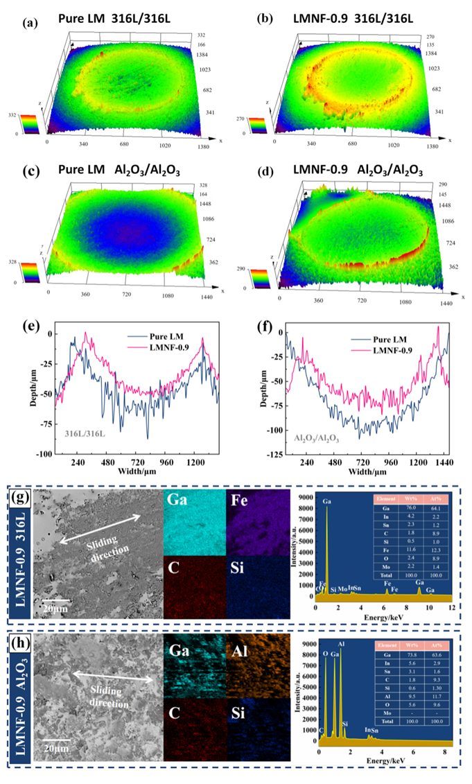 在摩擦磨損特性方面,LMNF的抗磨性能優(yōu)于純LM(見圖2)。與傳統(tǒng)液壓介質(zhì)相比,LMNF在極端載荷條件下具有更強大的承載能力,在高達200℃的溫度下具有更好的潤滑和耐磨性。對于316L摩擦副,有益的復合反應膜由SiC/石墨烯納米顆粒、各種金屬氧化物和LM-Fe合金組成,可以避免粘著磨損,減少LM腐蝕。對于Al2O3摩擦副,LMNF的主要優(yōu)點是引入SiC/石墨烯納米顆粒作為微軸承,并抑制可能的干摩擦接觸(見圖3)。