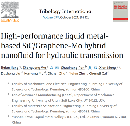 昆明理工大學吳張永團隊聯(lián)合美國猶他大學Shuaihang Pan團隊,和云南科威液態(tài)金屬谷研發(fā)有限公司孟仙、蔡昌禮等研究人員在《Tribology International》期刊(中科院一區(qū)Top, IF 6.2)發(fā)表題為“High-performance liquid metal-based SiC/Graphene-Mo hybrid nanofluid for hydraulic transmission”的論文(蔣佳駿博士研究生為第一作者,吳張永和Shuaihang Pan為共同通訊作者)。研究工作得到了國家自然科學基金的資助以及云南省液態(tài)金屬產(chǎn)品質(zhì)量檢驗中心在測試分析方面的協(xié)助。