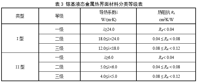 綜合我國(guó)鎵基液態(tài)金屬熱界面材料產(chǎn)品技術(shù)現(xiàn)狀和導(dǎo)熱系數(shù)效益極限,規(guī)定了鎵基液態(tài)金屬熱界面材料產(chǎn)品的等級(jí)要求(表3),其中,熱阻抗是在不超過(guò)300 kPa壓力下的測(cè)量值。