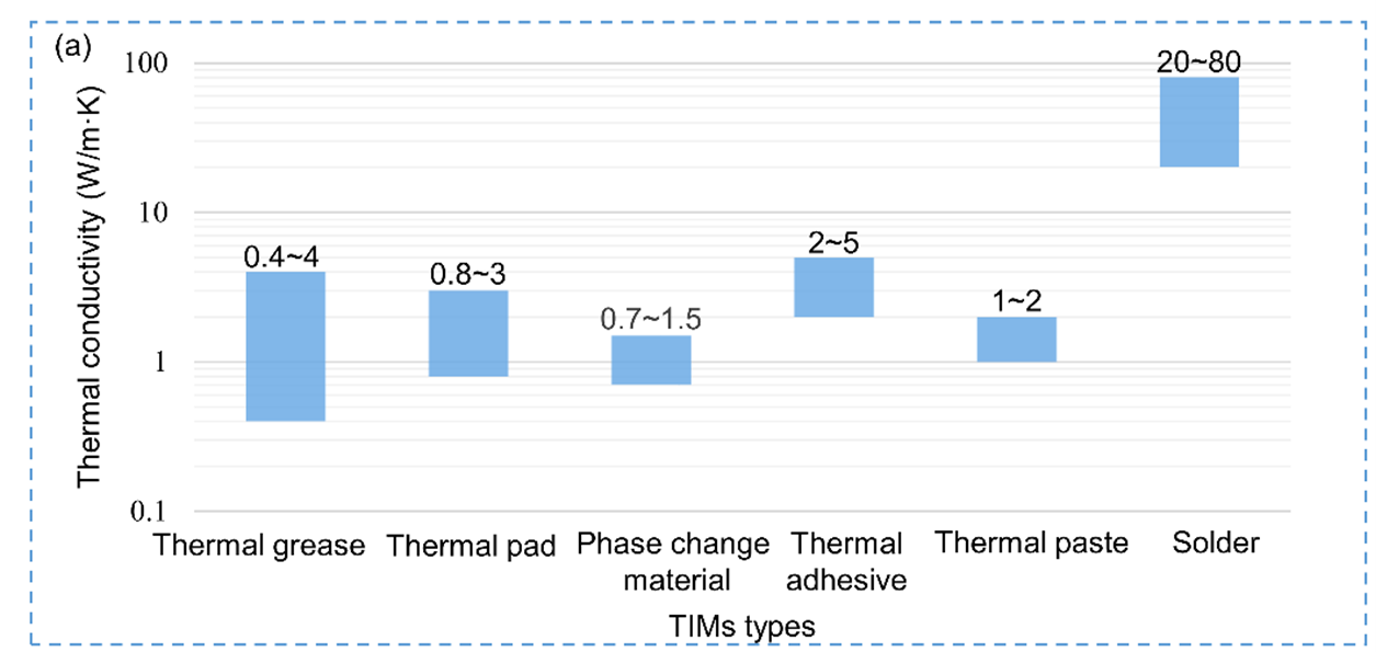 傳統(tǒng)的熱界面材料導(dǎo)熱系數(shù)范圍如圖3所示。導(dǎo)熱脂及其復(fù)合材料最為常用,具有較好的導(dǎo)熱性、較薄的接合層厚度、較低的粘附壓力,但容易出現(xiàn)泵出、干涸和相分離等現(xiàn)象。金屬焊料具有最高的導(dǎo)熱性,一般作為焊膏或預(yù)制箔使用,但在回流焊過(guò)程中存在氣泡、分層、高應(yīng)力和重復(fù)使用性差等問(wèn)題。除焊料外,大多數(shù)熱界面材料由無(wú)機(jī)固體填料和聚合物組成。前者一般是高導(dǎo)熱顆粒,如金屬顆粒(銀和銅等)、陶瓷顆粒(氮化鋁和氮化硼等)和碳基材料(碳納米管和石墨烯等),其作用是提高導(dǎo)熱性和控制熱界面材料的流變特性;后者一般是導(dǎo)熱性較差的物質(zhì),如硅油、硅脂、硅膠等。傳統(tǒng)熱界面材料面臨的普遍問(wèn)題是聚合物成分的熱導(dǎo)率太低,商用熱界面材料的熱導(dǎo)率最多只有5 W/(m·K)~8 W/(m·K)左右,逐漸不能滿足電子產(chǎn)品特別是高功率密度器件的散熱需要。