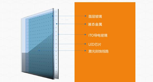 2、液態(tài)金屬材料的應用,避免了顯示屏上的導線,實現(xiàn)了玻璃原有的美觀與整潔,在看不見導線的情況下,實現(xiàn)玻璃屏顯示;